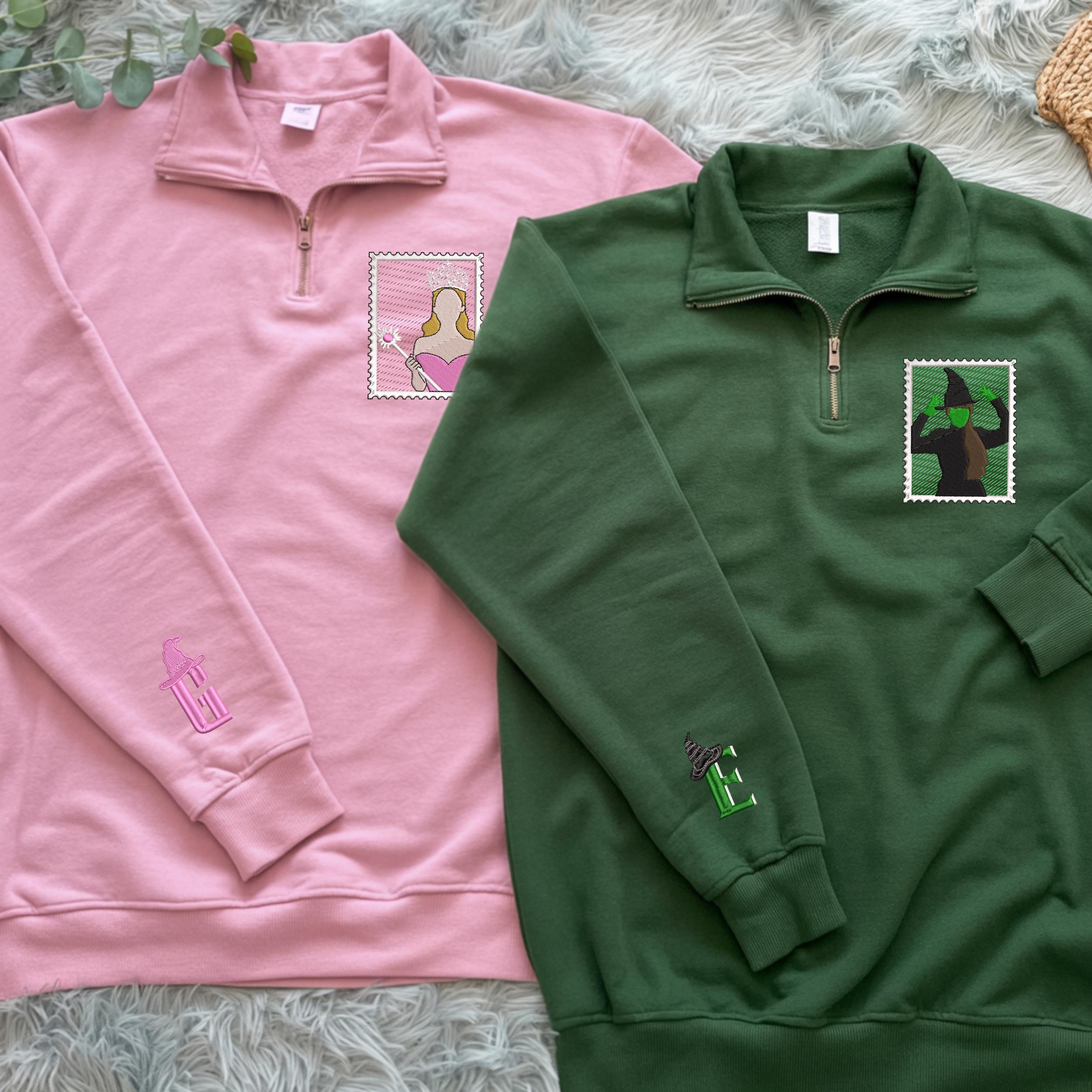 Wicked Elphaba And Glinda Stamp Unisex Embroidered Quarter Zip Wizard Of Oz Defying Gravity Embroidery Musical Movie Fan Gift